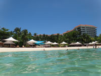 | ビーチからみたホテルの建物。ビーチに沿って、パラソルシートが並んでます。 |