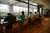 | テーブル席もありますが、カウンター席は外を向くスタイル。飛行機の離着陸を眺めながらの食事です。 |