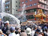 | 今年は3年に1度の本祭りということで、壮大な神輿連合渡御が見られました。別名「水かけ祭り」とも言われるこのお祭り、御神輿が通ると沿道から水がかけられます。神輿を担ぐ人たちからは、湯気が立ち上ってましたよ。近くで見ると、結構迫力のあるお祭りでした。 |
