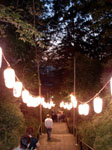 少しずつ日が沈んでくると、あちらこちらで明かりが灯されはじめました。本殿裏から日蓮聖人永眠の地へと続く階段の提灯は、今自分がいる世界と違う世界をつなぐ階段のような気がしました。 |