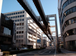 | 駅前広場から少し歩くと、先ほどのモノレールが道路の上を通っています。地元の人にとっては見慣れた光景かもしれないけど、私の目には結構新鮮!巨大な構造物は、ビルの間のわずかな空間までも占拠しています。ちょっとSFチックな雰囲気!? |