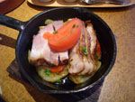 こちらがファヒータランチのメイン。お肉はチキン・ビーフ・ポークから2種選べるとのことで、私はチキン・ポークを選択。マリネしたお肉が野菜とともに、熱々の鉄板に乗って運ばれてきます。ほんと、ジュージューいってましたよ。 |