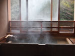 | 翌朝、目が覚めると、露天風呂からの水蒸気がくっきり。外が寒いからでしょう。この空気を吸うのも、ラドンの効果があっていいんですよね。それにしても、一晩中お湯が流れ続けていたなんて…贅沢、なんて思いつつ、朝風呂をたのしんだのでした。 |